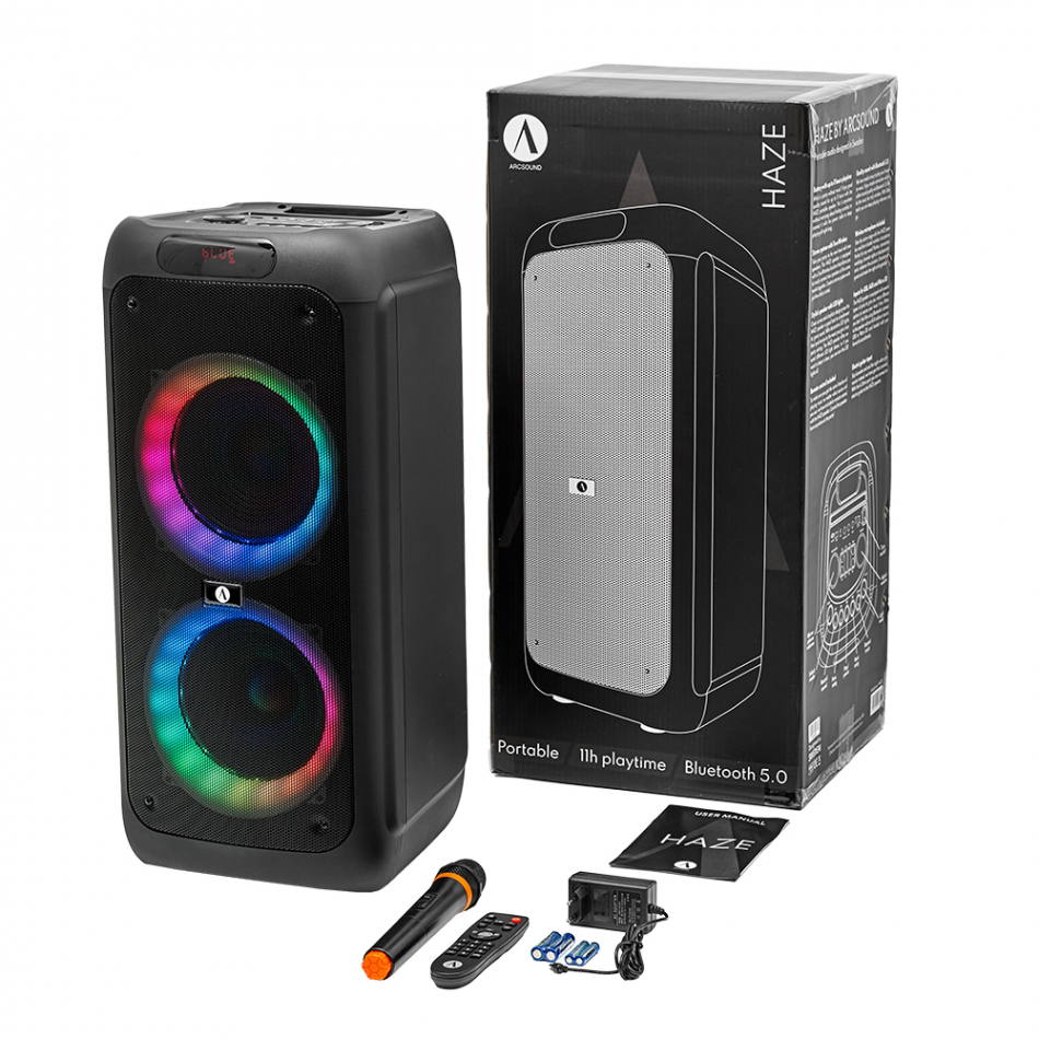 Partyhögtalaren: Arcsound HAZE G2 (generation 2) är en batteridriven partyhögtalare med Bluetooth och som har alla ingredienserna för en lyckad fest. I kartongen medföljer det en trådlös mikrofon, vilket öppnar upp möjligheterna till en underhållande karaoke-tillställning. Plus i kanten är att du inte behöver spela luftgitarr. Varför inte koppla in en riktig elgitarr och dra dina häftigaste riff?! Sånt imponerar. Det uppladdningsbara batteriet ger runt 10 timmars spelande, mätt på halv volymstyrka, och man kan ladda medans man spelar. Man kan även koppla högtalaren till närmaste vägguttag och därmed hålla festen rullande så länge man vill! Tack vare en imponerande bestyckning med dubbla 8" element och ett rejält förstärkeri, som lämnar ärliga 120 Watt, så kan Haze fylla rummet/lokalen med ett stort och högt ljud, och bjuda på timmar av härlig dans. Tänk på att du skall ladda batteriet i åtta timmar innan du använder högtalaren första gången!