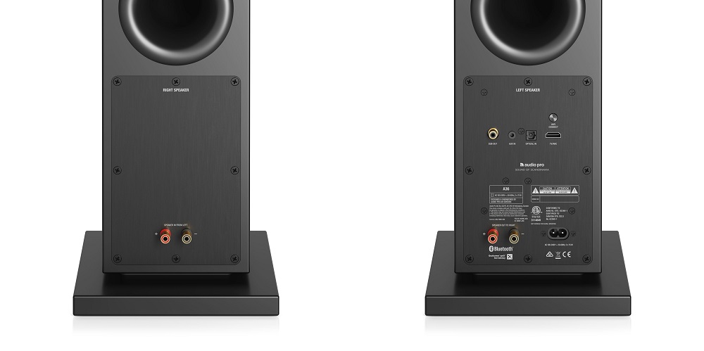 Både A26 och A36 är äkta stereohögtalare, alltså att man har två fysiska kabinett. Fördelen med detta - jämfört med en single-stereo högtalare - är att ljudbilden blir bredare och därmed öppnar upp sig då mer ljud fylls ut i hela rummet. Den inbyggda förstärkaren sitter i den vänstra högtalaren, som sedan sammanlänkas med den högra via en hederlig högtalarkabel. Så tänk på att den aktiva sidan skall alltså stå på vänster sida om platt-TV:n.