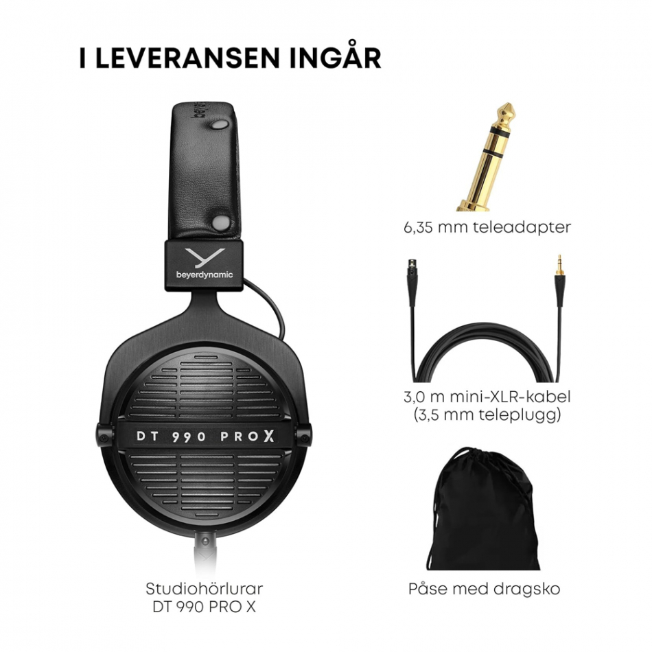 Beyerdynamic DT 990 PRO X är en förstklassig öppen over-ear hörlur, som lämpar sig lika bra i studion som för en avkopplande stund i hemmet. Detta är en uppdaterad version av den klassiska studiohörluren DT 990 PRO med dess design och utseende – men nu med förbättrad komfort, löstagbar kabel och de nya STELLAR.45-elementen, som är hämtade från DT 700 PRO X och DT 900 PRO X. Elementen har en lättare talspole vilket bidrar till bättre transientrespons samt högre upplösning i toppregistret. Dessutom är känsligheten högre, vilket gör att även svagare hörlursförstärkare kan hantera hörluren med gott resultat. Man kan sammanfatta det med att detta är en sluten hörlur med exceptionell ljudkvalitet, hög detaljåtergivning och bred ljudbild, perfekt för både professionell mixning, inspelning och musiklyssning. Tack vare en låg impedans på 48 Ohm fungerar hörlurarna lika bra med laptops och mobila enheter som med professionell studioutrustning. Givetvis växer ljudkvaliteten mest och bäst när de sammanlänkas med en kvalitativ hörlursförstärkare. Den robusta konstruktionen och de mjuka öronkuddarna gör DT 990 PRO X till en bekväm följeslagare för långa sessioner – både i studion, hemmet eller om du är på språng.
