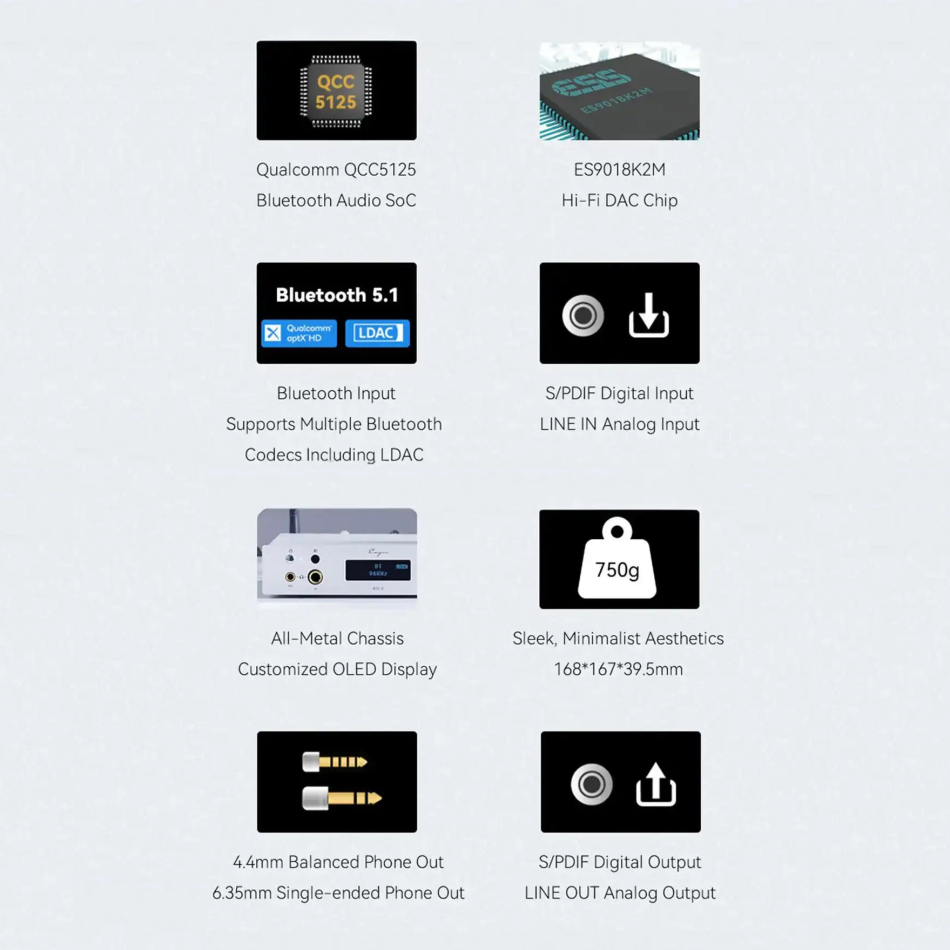 Man har baserat mycket av själva uppbyggnaden kring DAC-chipet ES9018K2M från ESS Sabre, med låg strömförbrukning och förmågan att leverera en mycket ren, detaljrik och dynamisk ljudsignal. Tillsammans med en balanserad 4-kanals förstärkarkrets (positiv/negativ separation) säkerställer det att signalen förblir ren ända från digital källa till hörlursutgång. Den balanserade kretsdesignen minimerar effektivt brus och distorsion — vilket betyder att nyanser i musiken, från tyst bakgrundsreverb till aggressiva transienter, bevaras med hög integritet. Resultatet är ett ljud som känns öppet, dynamiskt och korrekt, snarare än tillrättalagt — ett ideal för audiofila lyssnare som vill ha originalkänslan tillbaka.