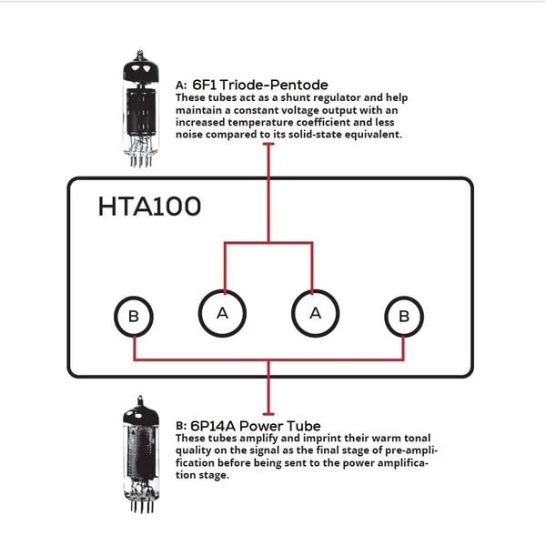 Stereoförstärkaren: Dayton Audio HTA100 är en mycket prisvärd, mångfunktionell och framförallt välljudande stereoförstärkare, som med sina rörbestyckade signalkretsar får en hög trivselfaktor i sin musikaliska återgivning. Designen är både läcker att lägga ögonen på, samtidigt som den är kompakt med en bredd på 27 cm som kan underlätta installationen rejält. Oavsett om du är ute efter en grym stereoförstärkare till ditt vardagsrum eller söker en kvalitativ musikpartner till arbetsrummet, så komme HTA100 att leverera. De glödande rören gör att man gärna ställer förstärkaren synlig. Oavsett om du vill streama musiken trådlöst (via Bluetooth), få bättre ljud från en platt-TV eller avnjuta det svarta vinylguldet, så ger den här förstärkaren dig möjligheterna. Konstruktionen och kopplingsmöjligheterna påminner mycket om storebror HTA200, men där skillnaden ligger i komponentkvaliteten, rörbestyckningen samt dess uteffekt. HTA100 är tänkt att driva ett par mindre stativ- eller vägghögtalare och om man vill utöka anläggningen med en aktiv subwoofer så finns det en dedikerad subutgång. Så fort man lägger öronen till den här skapelsen så inser man snabbt att Dayton Audio menar allvar med sin HTA-serie med stereoförstärkare!