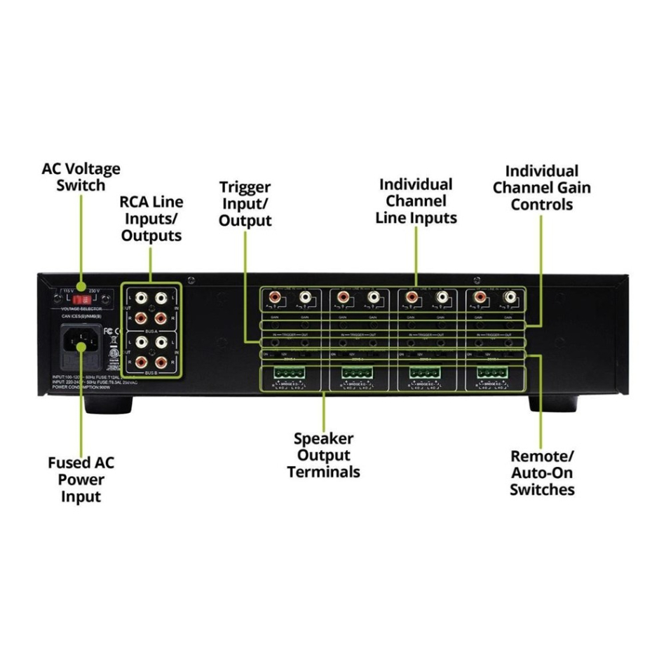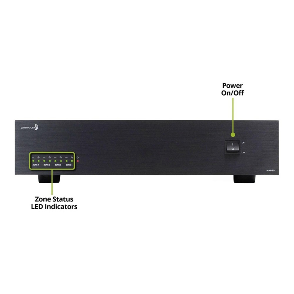 Hos MA880 finner vi hela 8 separata förstärkarkanaler, vilket innebär att man kan koppla in fyra högtalarpar och därmed täcka ett stort behov av multiroomljud för hemmet, kontoret eller butiken. Hos MA880 lämnar respektive kanal 80 Watt RMS i 8 Ohm, och det dubbla i 4 Ohm. Likaså kan MA880 bryggas och du kan då få ut 4x160 Watt men då skall man inte belasta förstärkaren under 8 Ohm. Det går även att kombinera hur du vill använda steget. Du kan som exempel bryggkoppla och få ut mängder med effekt till dina stereohögtalare till vardagsrummet, och sedan driva 3 andra högtalarpar för multiroom-ljudet.