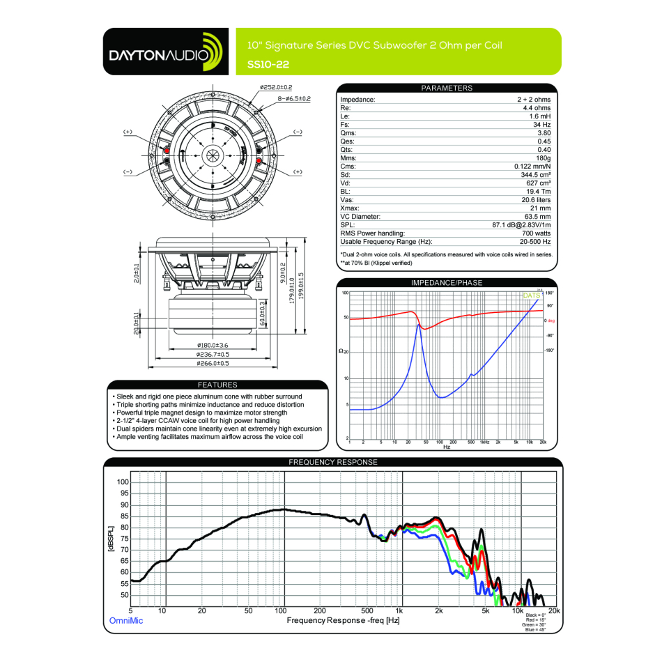 SS10-22 är konstruerat för att leverera mer än vad storleken först antyder. Kombinationen av relativt kompakt diameter, lång linjär slaglängd och stark motorstyrka gör att elementet kan flytta mycket luft utan att tappa greppet om återgivningen. Aluminiumkonen bidrar med hög styvhet, vilket hjälper till att hålla uppbrytningar under kontroll, medan gummiupphängningen ger den följsamhet som krävs för djup och fysisk bas. Dayton Audio har också byggt elementet med dubbla spindlar, något som märks i sättet konstruktionen prioriterar rak och stabil rörelse när belastningen ökar. Resultatet är ett baselement som känns mer som ett verktyg för seriös subbas än som en allmän woofer. Det är just denna blandning av mekanisk kontroll och användbar slagvolym som gör SS10-22 intressant i genomtänkta DIY byggen.