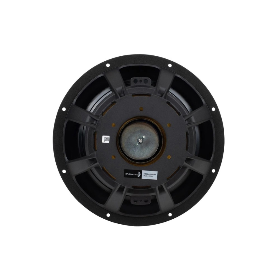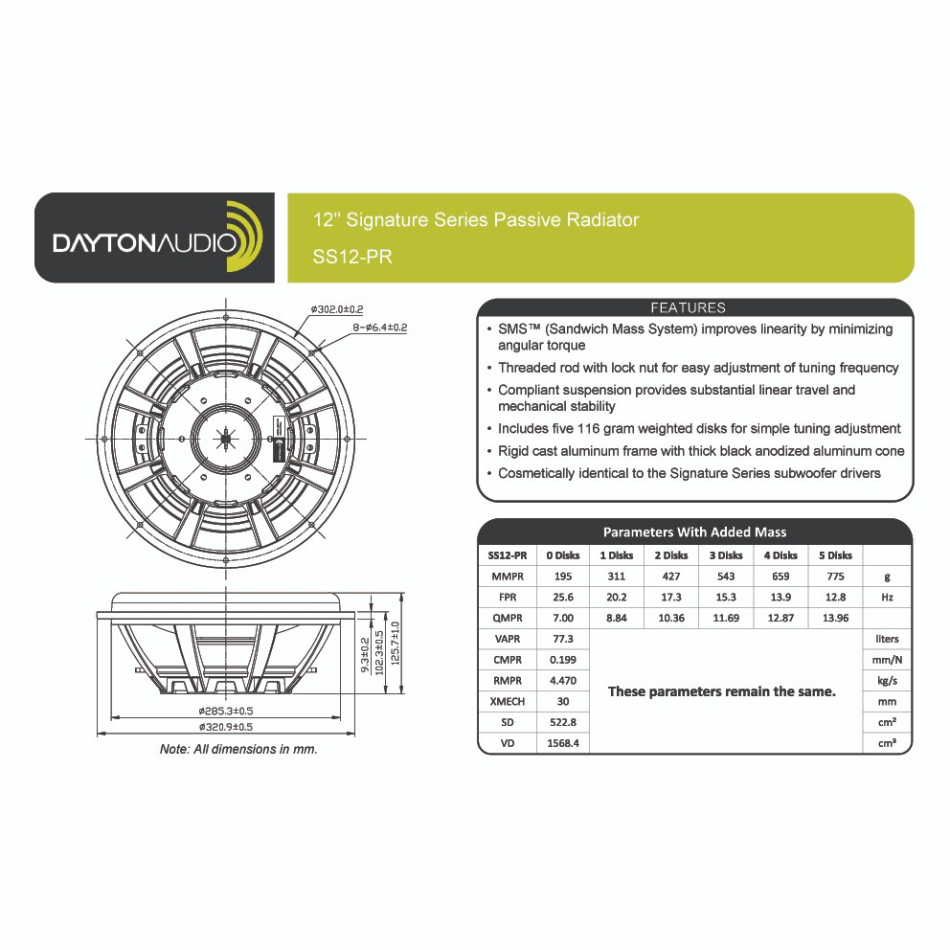 SS12-PR är byggd med samma visuella och mekaniska ambition som Dayton Audios aktiva Signature-element. Den gjutna aluminiumkorgen skapar en styv grund som håller geometri och upphängning under kontroll när systemet pressas, medan den anodiserade aluminiumkonen ger hög vridstyvhet och låg egenpåverkan. Resultatet är inte bara ett mer enhetligt utseende i färdiga byggen, utan också en radiator som är tänkt att arbeta med seriös slaglängd utan att kännas överdimensionerad eller klumpig. Monteringsmåtten visar dessutom att elementet är lätt att planera in i riktiga projekt, med en ytterdiameter på 320,9 mm, urfräsning på 285,3 mm och byggdjup på 102,3 mm. Det här är kort sagt en passiv radiator som känns utvecklad som en riktig systemkomponent och inte som en eftertanke.