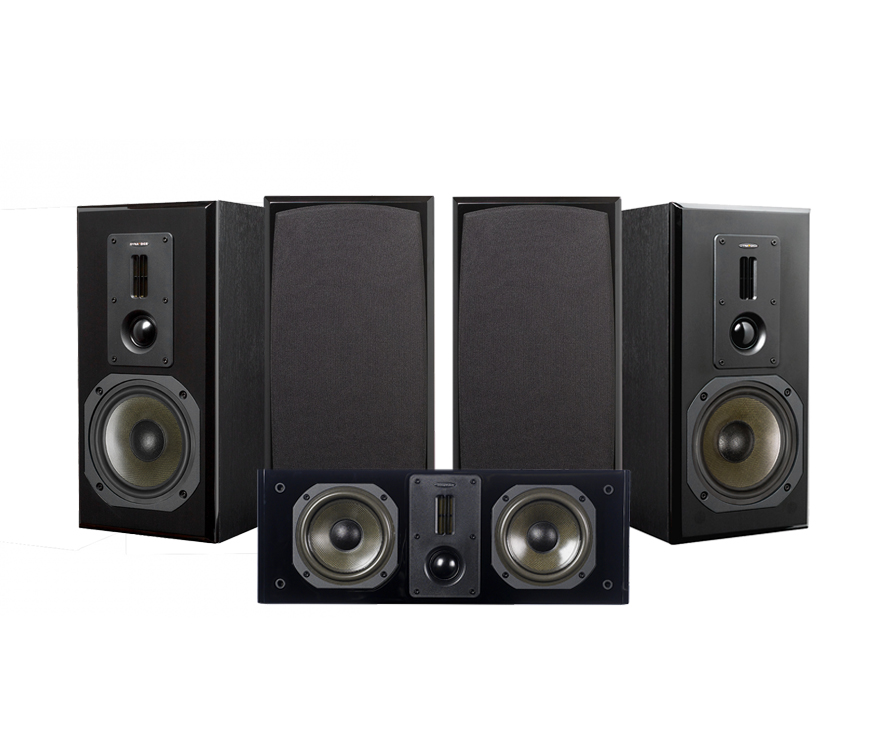 Front- och surroundhögtalarna: Dynavoice Definition DM-6 MKII är den resliga och kraftfulla stativhögtalaren i svenskarnas mycket omtyckta och numer förbättrade Definition-serie. Här talar vi om en oerhört påkostad och genomtänkt konstruktion som ljudmässigt bräcker det mesta i prisklassen! Byggkvaliteten imponerar lika mycket som ljudet, där respektive högtalare väger in på dryga 10 kg. I sin andra generation har Dynavoice framför allt uppgraderat bas/mellanregisterelementet samt sett över delningsfiltret. Förbättrade membran, nya gummiupphängningar och kraftigare magnetstrukturer resulterar i en högtalare som spelar med mer kontroll och stadga. Bättre "Definition" skulle man kunna säga. När Hifi&Musik utvärderade föregångaren glömde de vid flertalet tillfällen bort att det var stativhögtalare de lyssnade till, och häpnade över dess basregister. DM-6 MKII lyfter barriären en bit till! De kräver gärna en strömstark förstärkare för att visa sina bästa sidor. Hifi eller hemmabio? Oavsett, här har du din biljett till underhållningen!