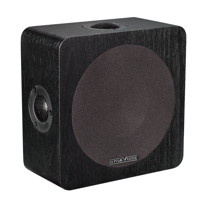 Dynavoice Magic Around-5 EX v3 är en snyggt designad surroundhögtalare, som skalla monteras på väggen via dess nyckelhålsfästen. Konstruktionen kallas för quadpolär, där vi finner ett frontmonterat 5.25" element samt hela fyra diskanter på kabinettets alla sidor. Det gör att ljudet sprids åt alla håll, vilket ger en lite annorlunda men samtidigt rätt häftig rymdkänsla. Högtalaren är perfekt för dig som vill ha ett bra surroundljud trots att du har soffan placerad direkt mot bakväggen. Tack vare att anslutningsterminalen är insjunken så kommer högtalaren att hänga helt platt mot väggen. Nyckelhålsfästena fungerar även som distans mot väggen, vilket gör att du lätt får plats med högtalarkabeln. När du packar upp högtalarna så ligger Dynavoice-märket vid sidan om. Tygfronten är förberedd för att fästa märket på långsidan och kortsidan. Detta gör att du kan välja vart du ska sätta märket, beroende på hur du sätter upp högtalarna.