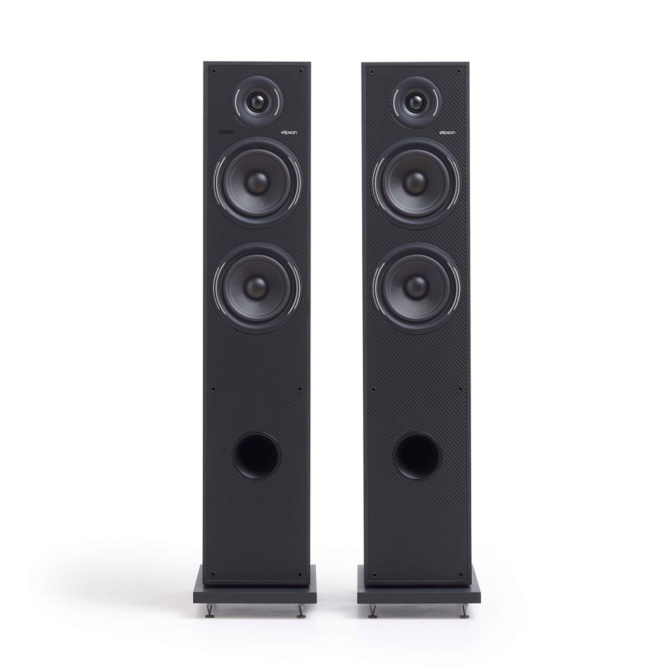 - Elegant basreflexdesign i kompakt golvhögtalarformat med högkvalitativ finish i svart och kolfiber