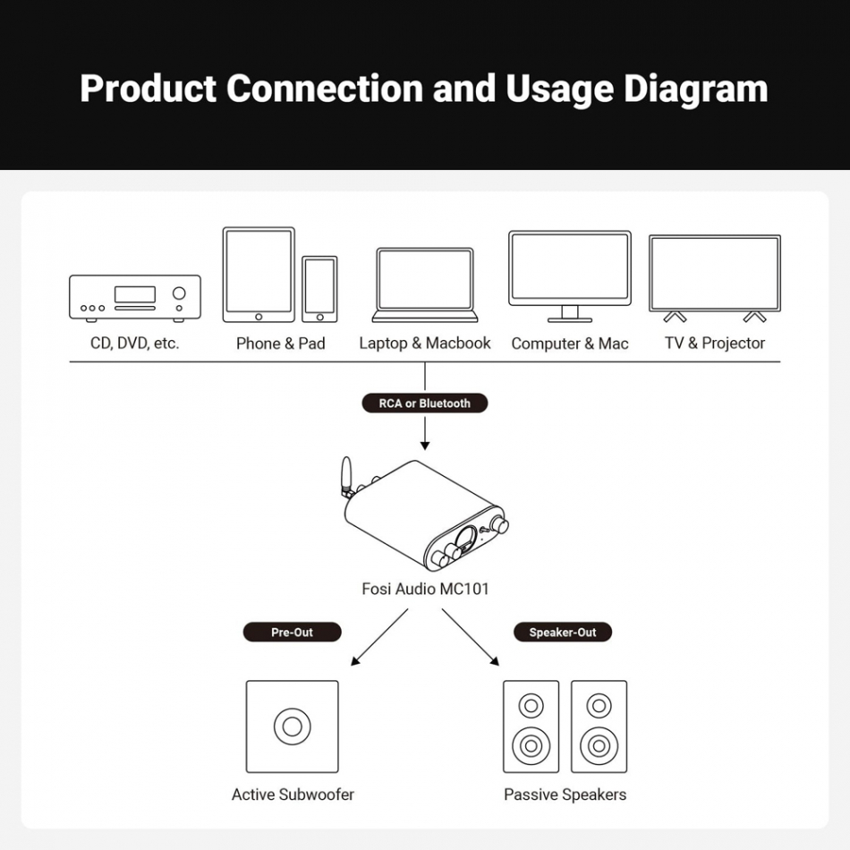 Stereoförstärkaren: Fosi Audio MC101 är en kompakt stereoförstärkare i instegsklassen som bjuder på en övertygande ljudkvalitet för pengarna, och som även har en riktigt tilltalande design. Sett till prisbilden så är byggkvaliteten förbluffande hög, där konstruktionen är baserad kring klass D-förstärkarteknik och ett högeffektivt TPA3255-chip från Texas Instruments, som lämnar bra med kraft från det kompakta chassit. Trots sitt lilla format klarar den att leverera en imponerande uteffekt på 100 Watt/kanal i 4 Ohm, vilket är ett mätt maxvärde. Föredrar du att streama musiken från din mobiltelefon eller dator så har man utrustat MC101 med Bluetooth 5.3 för en hög ljudkvalitet och stabil räckvidd. Centrerat på frontpanelen finner vi en läcker VU-mätare, tillsammans med reglage för ingångskälla, tonkontroller och volym. Allt är lättåtkomligt vilket gör förstärkaren till ett perfekt inslag på arbetsbordet eller intill datorn.