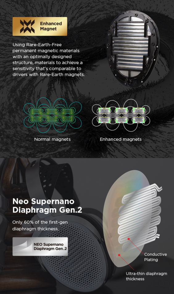 Kärnan i ljudsignaturen i Edition XV är Hifimans NEO Supernano™-membran, en ny generation ultratunna filmmembran som är 40 % tunnare än tidigare Supernano-modeller. Denna extrema tunnhet möjliggör blixtsnabb respons och minimal tröghet, vilket ger överlägsen transienthantering och detaljåtergivning. Varje mikroskopiskt lager är jämnt belagt för att optimera magnetflödet över hela ytan, vilket minimerar distorsion även vid höga ljudtryck.