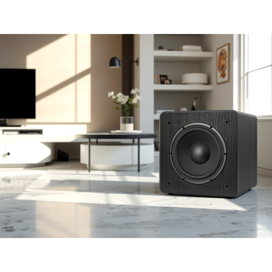 Den aktiva baslådan: Dynavoice Challenger Sub-8 är aktiv subwoofer i den omtyckta och storsäljande Challenger-serien. Vi talar om en genomtänkt konstruktion, där man genom den slutna principen valt att lägga prio på kvalitet framför kvantitet. Det finns konkurrenterande basar i prisklassen som "fläskar" på mer, men få kan matcha den definierade och tighta karaktären som Sub-8 har. Av ljudmässiga skäl har man valt ett klass A/B-steg framför ett digitalt. Med en uteffekt på 90 Watt RMS får man väldigt god kontroll över konutslagen. Det gör den till ett perfekt komplement för mindre system uppställda i mindre till mellanstora rum. Det kompakta formatet gör baslådan mer lättplacerad, men som alla basar så förtjänar den omsorg för att finna rätt placering i rummet. Dess rundade hörn bidrar till den läckra och slanka framtoningen.
