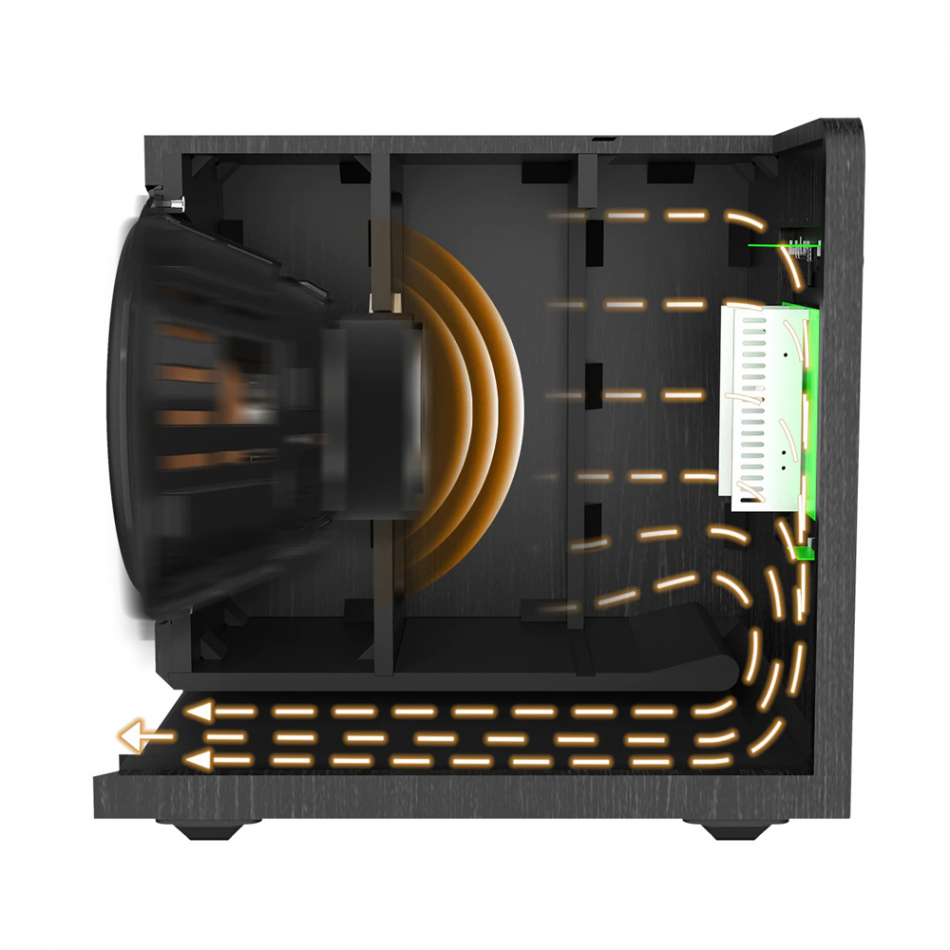 - Kabinett med rundade sidor och vibrationsdämpade fötter ger en stadig grund för maximal basprestanda