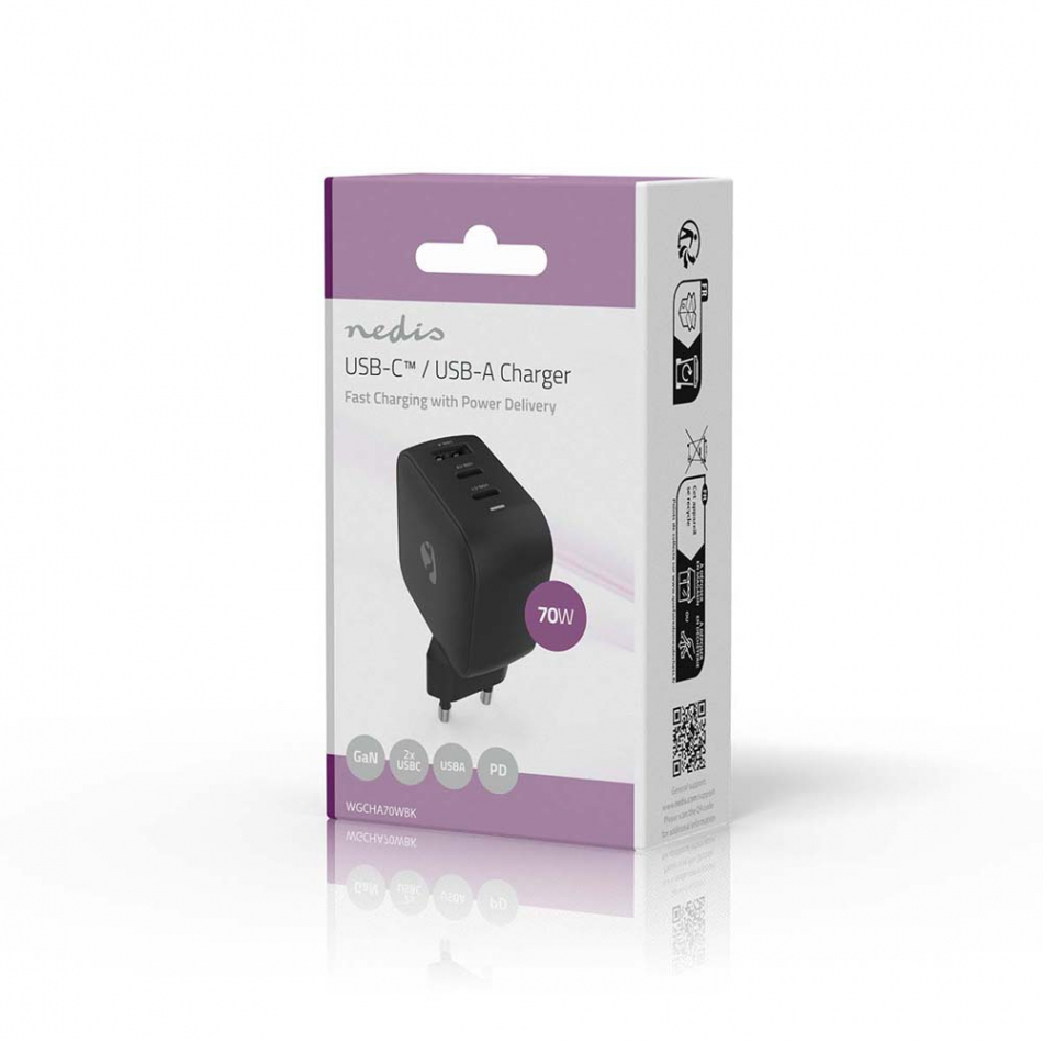 Nedis WCH-A70 GaN-väggladdare 70 Watt, svart i gruppen Övrigt / Elektroniktillbehör hos Ljudfokus.se (176WGCHA70WBK)