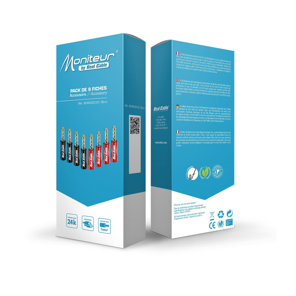 Real Cable BFA6020 är ett 8-pack bananpluggar som hanterar kablar upp till 7 mm². BFA-röret ger högt kontakttryck för bättre ledaregenskaper, såpass att kontakten nästan får nästan pressas in i terminalen. Men detta gör att man får minimal signalförlust vid övergången från kontakt->anslutningsterminal. De färgmärkta ytterhöljena i icke-ledande plast förhindrar att kortslutning kan ske, och kontakten monteras fast på kabeln med två skruvar som vrids åt. Fransmännen har varit schyssta och skickar med en nyckel för åtdragning av kontakten på högtalarkabeln. Real Cable´s namn står med vit text på respektive kontakt, vilket ger en väldigt snygg termineringar på just din Real Cable-högtalarkabel.