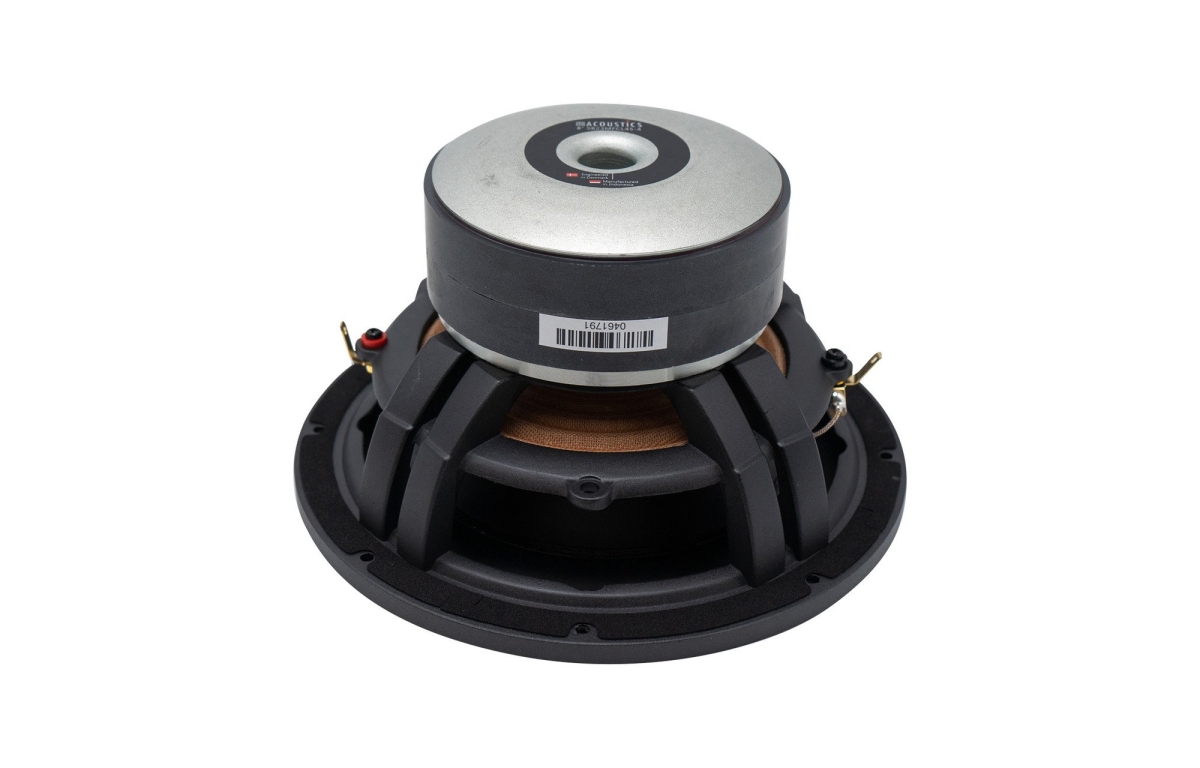 Den generöst dimensionerade talspolen på 45,5 mm är lindad på en förstärkt glasfiberspoleformare som är icke-ledande, vilket ger hög mekanisk stabilitet och låg intern dämpning. Den långa slaglängden på 24 mm (peak-to-peak) möjliggör stora membranrörelser utan distortion, vilket är avgörande för djup och kraftfull bas. Motorsystemet är stort och ventilerat med en magnetvikt på 2,0 kg och en flödestäthet på 1,03 Tesla, vilket ger en stark och effektiv drivkraft som bibehåller kontrollen även vid höga ljudnivåer.