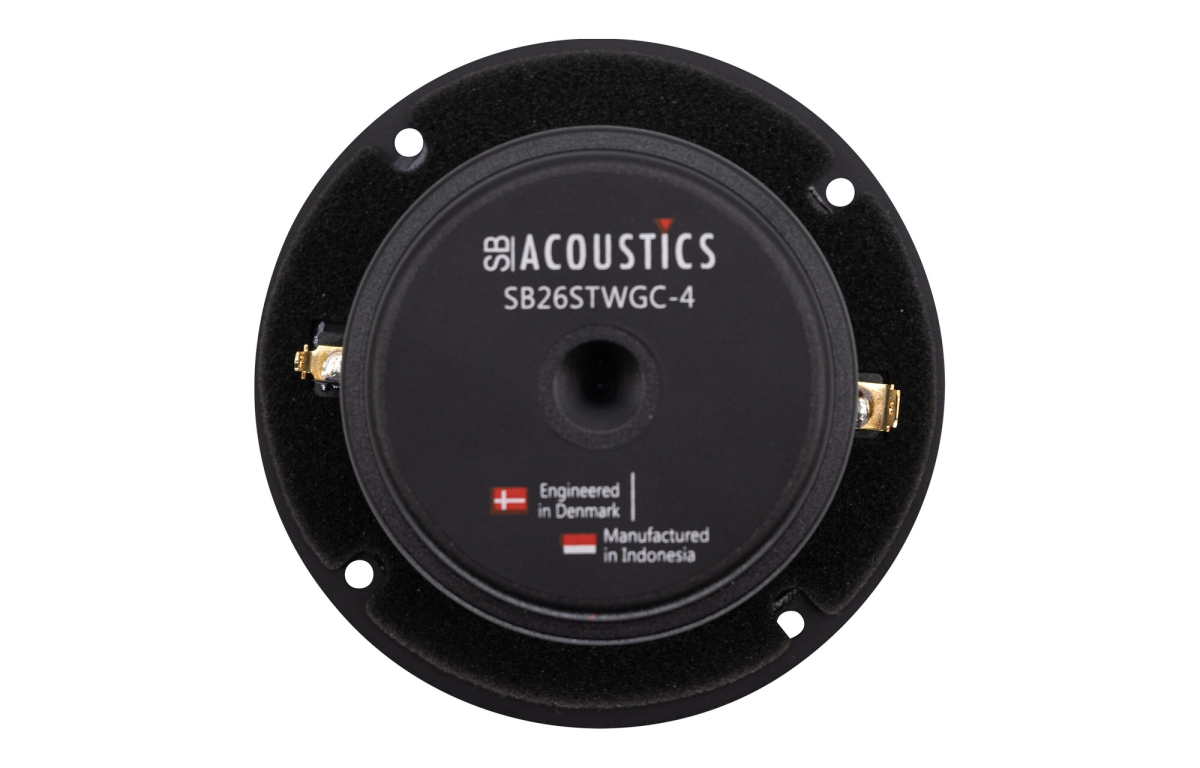 SB Acoustics SB26STWGC-4 är en högkvalitativ 1" textildome-tweeter med integrerad aluminium waveguide, särskilt framtagen för att leverera kontrollerad spridning och en jämn, naturlig diskantåtergivning. Denna tweeter är en del av SB Acoustics avancerade serie och kombinerar noggrann teknisk konstruktion med fina materialval för att minimera distorsion och optimera dynamik. Med sin kopparkapsel reduceras talspoleinduktansen vilket bidrar till en snabbare transientrespons och förbättrad fasstabilitet. Den ventilerade polpelaren och den icke-reflektiva bakre kammaren säkerställer en renare och mer transparent ljudbild, medan soft fabric dome ger en mjuk och behaglig diskant utan hårda toppar. SB26STWGC-4 är designad för att användas med ett högpassfilter på cirka 2600 Hz och är idealisk för krävande hifi- och ljudprojekt där precision och musikalitet står i fokus.