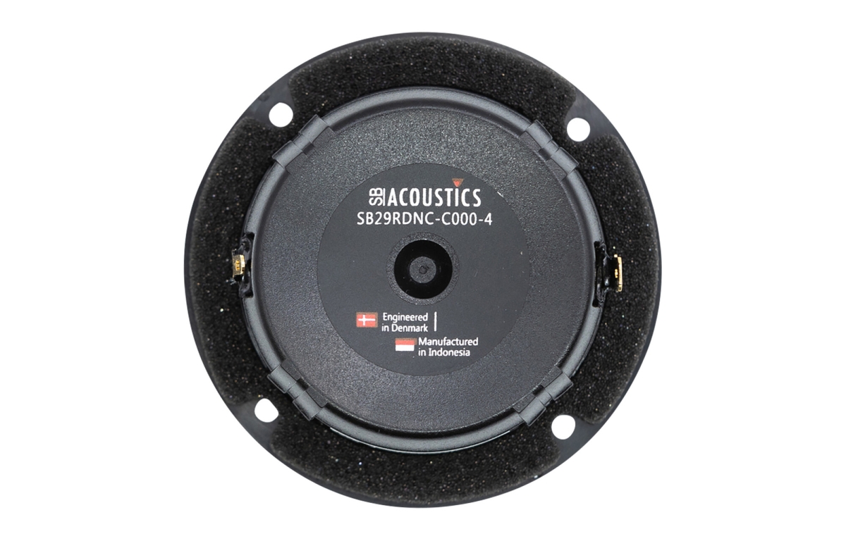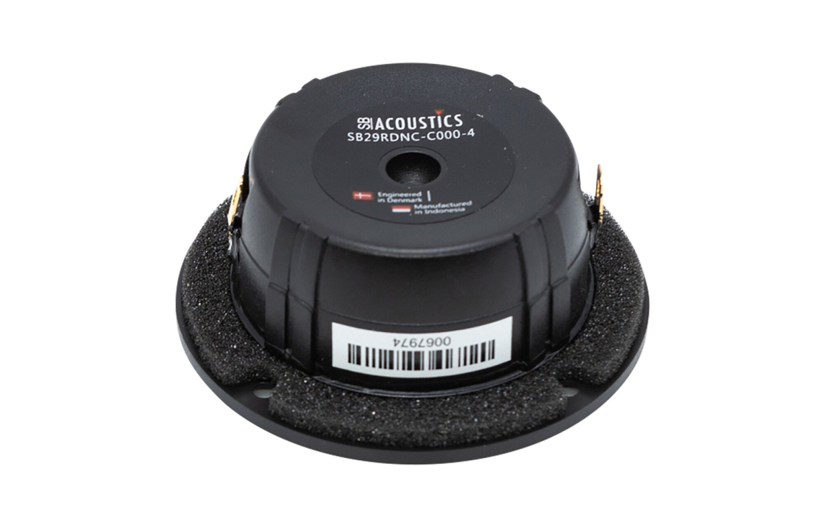 SB29RDNC-C000-4 använder en ring-dome med en unik non-resonant design som kraftigt reducerar membranets egenresonanser, vilket annars kan färga ljudet i diskantområdet. Kopparkapseln på polstycket är en viktig innovation för att sänka talspolens induktans, vilket ger en mer linjär frekvensgång och minskad fasförskjutning. CCAW-talspolen är lätt och styv, vilket möjliggör snabb och exakt membranrörelse med minimal förlust. Den interna tryckutjämningen med flödesresistor säkerställer att lufttrycket i bakre kammaren regleras mjukt, vilket minskar oönskade resonanser och bidrar till en jämn och naturlig diskantåtergivning. Sammantaget ger konstruktionen en stabil och detaljerad topp med hög upplösning.