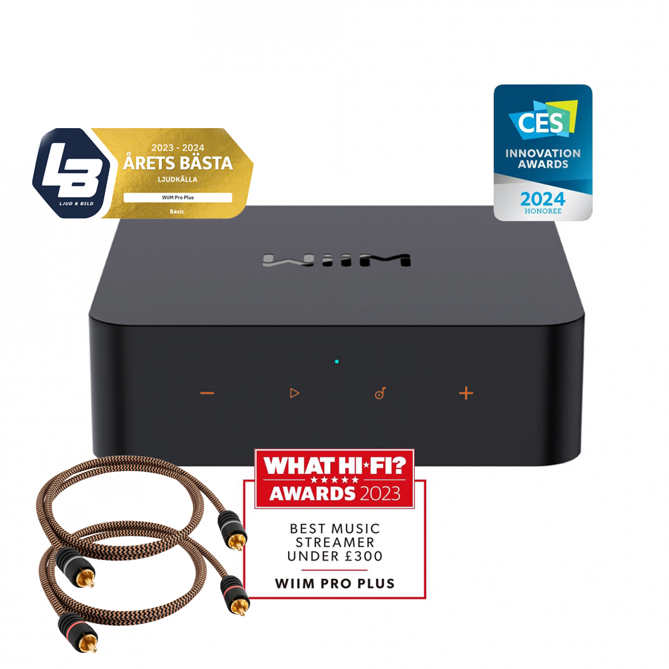 Nätverksstreamern: WiiM PRO Plus är en ny version av en redan välljudande och teknikspäckad nätverksstreamer. Den främsta skillnaden med den här Plus-upplagan är att man hottat upp ljudet mera. Som CPU (processor) finner vi här Quadcore A53 med 512 MB minne (jämfört mot 128 MB i minsta lillebrodern WiiM Mini). Det samtliga av syskonen delar är AirPlay 2, men Pro och Pro Plus erbjuder genom sin förbättrade hårdvara även möjligheten att bygga multiroom via Chromecast, vilket tar streamingmöjligheterna till nya nivåer. Enheten är även kompatibel med Amazon Alexa, Apple Siri och Google Voice för att kunna styra streamern via sin röstassistent. På baksidan finns en analog stereoutgång (RCA) där den interna D/A-omvandlingen sker genom ett AKM 4493SEQ DAC-chip. Om man vill lyfta ljudet ännu mer så kan signalen matas digitalt ut (optisk + coaxial), där då den mottagande enheten gör D/A-omvandlingen och sätter ljudprägeln. Tänk på att man ej kan volymjustera musiken via den optiska utgången. Saknas nätverk där enheten skall brukas så kan man koppla upp sig på Bluetooth, lite som en plan B.