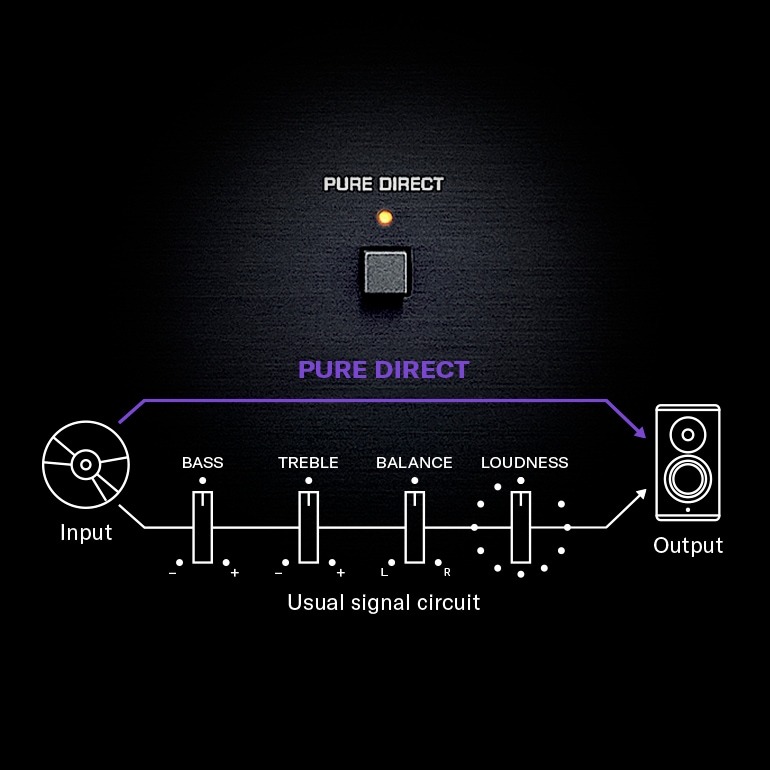 Med Pure Direct-läget aktiverat så får ljudsignalen kortaste möjliga kretsväg, där man då förbikopplar buffert-förstärkning och ton-, loudness-, och balans-kontrollerna. Ju kortare signalväg så får man i både teorin och praktiken ett renare ljud då mindre komponenter kan inverka på ljudkvaliteten.